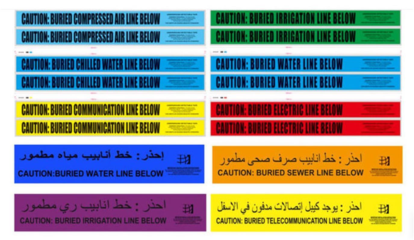 เทปเตือนใต้ดินที่ตรวจจับได้เป็นเทปผสม PET / ฟอยล์ / โพลีที่ลามิเนตเป็นพิเศษ การผสมผสานที่ยอดเยี่ยมนี้ (กับโพลีเอสเตอร์) ให้คุณสมบัติความแข็งแรงเป็นพิเศษเมื่อเทียบกับเทปเตือนที่ตรวจจับได้ประเภทโพลีเอทิลีนทั้งหมด ข้อความสีดำตัวหนาบนพื้นหลังที่เข้ารหัสสี APWA ได้รับการบำบัดเพื่อไม่ให้เสื่อมสภาพหรือซีดจางเมื่อสัมผัสกับด่าง กรด หรือองค์ประกอบที่ทำลายล้างอื่นๆ ใต้ดิน
